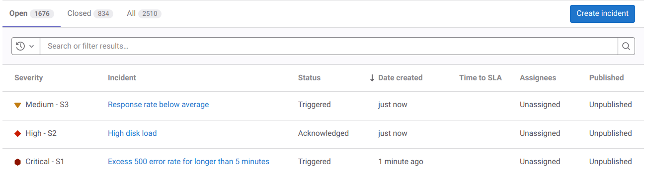 • State: To filter incidents by their state, select Open, Closed, or All above the incident list.
